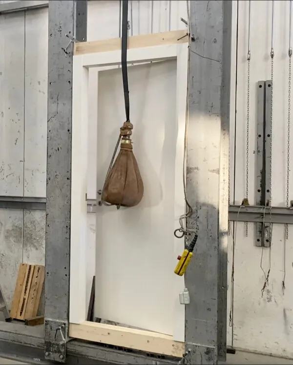 Questa norma valuta la resistenza all’urto da parte di un corpo molle di un peso prefissato, simulando calci o spinte, contro l’anta chiusa e fissata al suo telaio. Serve a controllare che la porta non subisca danni significativi in caso di impatti accidentali.