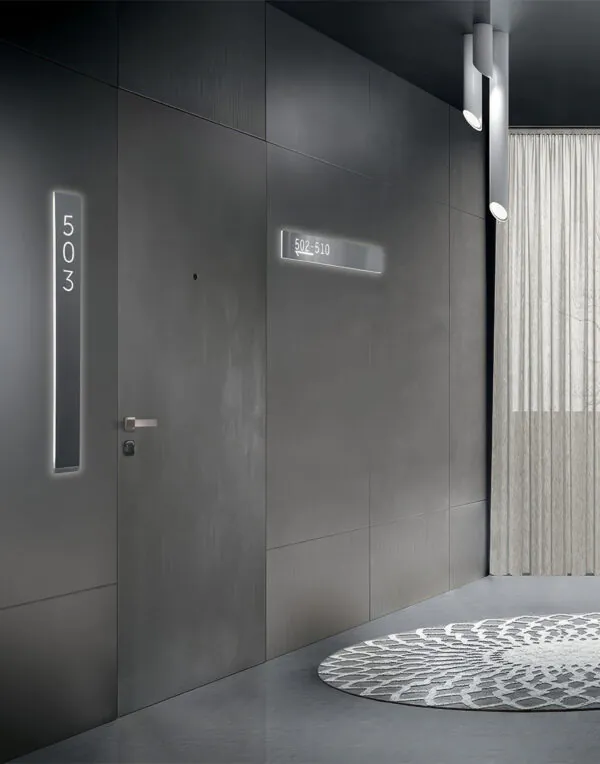 Con telaio in alluminio, cerniere a scomparsa e chiusura magnetica, le porte a filo muro della collezione Eterea Hotel garantiscono resistenza al fuoco, isolamento acustico e massima pulizia visiva.